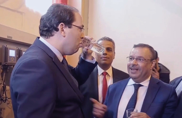- Youssef Chahed, primer ministro tunecino, bebiendo agua del punto de entrega de la desaladora.