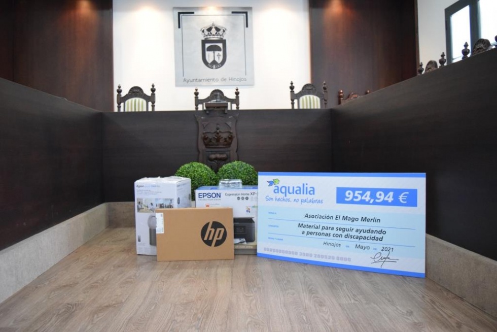 Un ordenador portátil, una impresora multifunción con su correspondiente recambio de tinta y un purificador de aire, todo por valor de 954’94€, han sido entregados por el jefe de Servicio de Aqualia en la localidad, Juan Carlos Benítez, a la asociación, representada por su presidenta, Ana María Franco Díaz, así como por otras socias de la misma.