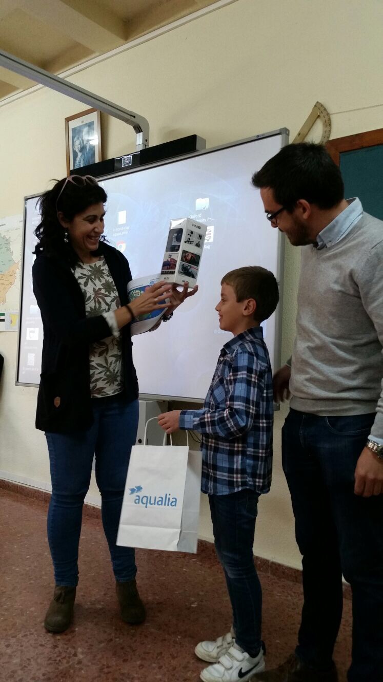 Alejandro, ha recibido en el Colegio, rodeado por sus compañeros, como premio, una cámara de fotos acuática, que le ha entregado personalmente Josefa Ruíz Carrasco, teniente alcalde de la población, junto a Gabriel Morales Manchón, jefe de servicio de Aqualia en el municipio.