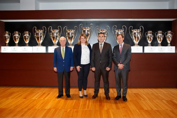 Emilio Butragueño, director de Relaciones Institucionales del Real Madrid, Alicia Jiménez, alcaldesa de Mazarrón, e Higinio Martínez, director de la Delegación Levante de Aqualia han rubricado el acuerdo en el estadio Santiago Bernabeu