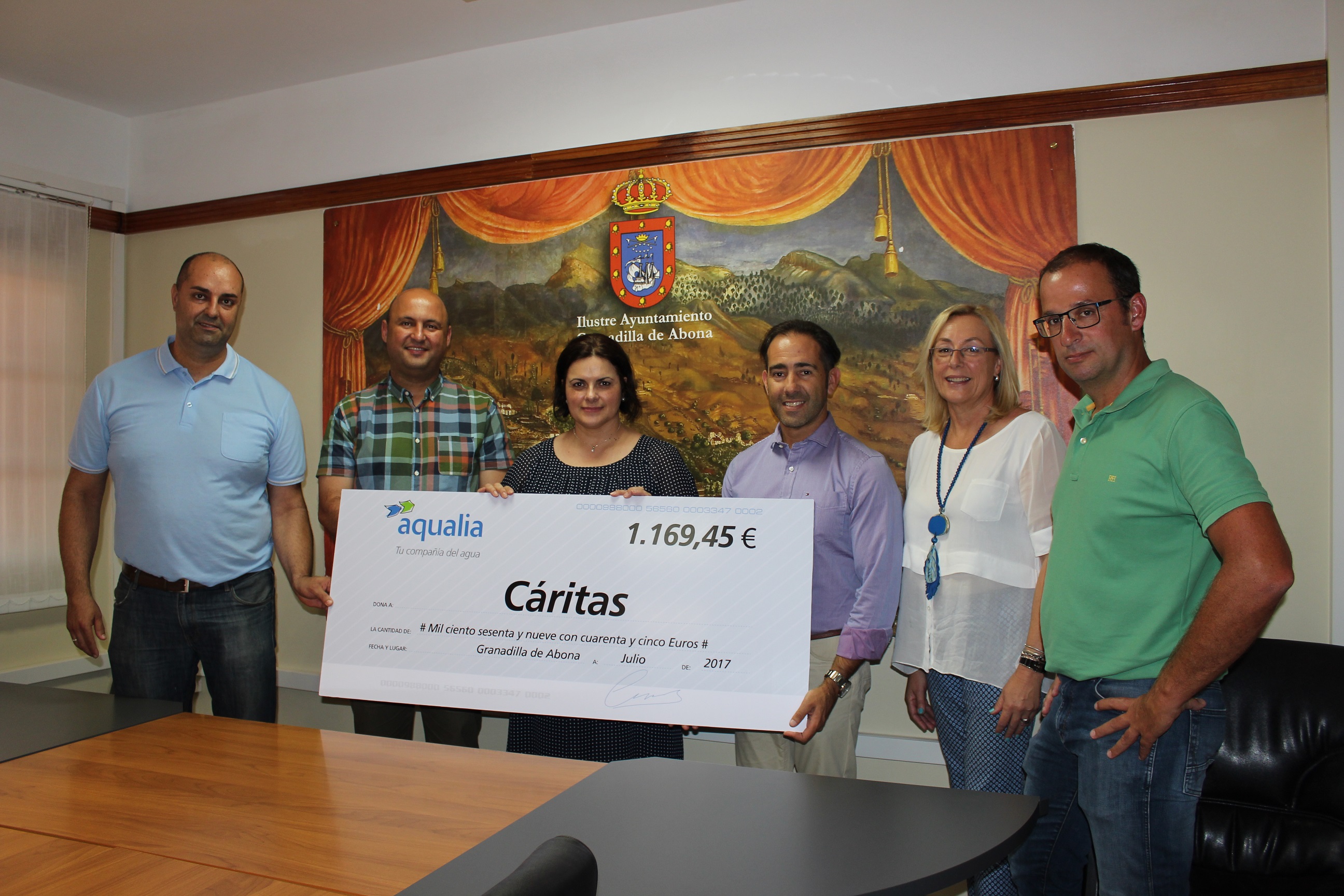 Manuel Acosta, jefe de servicio de Aqualia, la empresa que gestiona el Servicio Municipal de Aguas de Granadilla de Abona, ha entregado a Rosa Martín, secretaria de Cáritas Diocesana de Tenerife, un talón simbólico de la aportación de 1.169’45 euros que la empresa realiza, fruto del convenio de colaboración firmado ent...