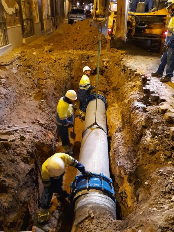 Aquajerez ha trabajado toda la madrugada para reparar en tiempo récord la avería en la calle Medina que afectaba a la conducción que trae el agua desde Tempul y el Consorcio